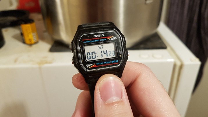 Pour mesurer le temps, j’utilise une vielle monte LCD avec fonction chronomètre. Elle doit avoir au moins 20 ans mais marche toujours très bien.