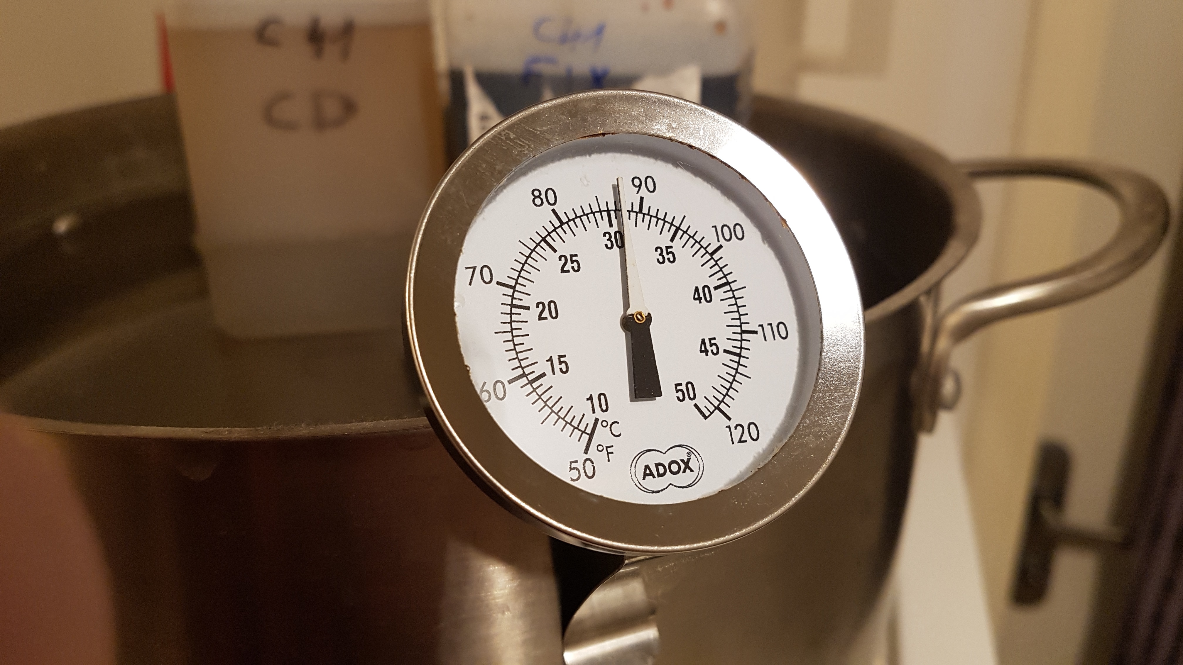 Si vous comptez faire un autre développement juste après, remettez le flacon dans le bain marie pour maintenir la chimie à température. Il y aura pas besoin d’attendre ensuite pour commencer le développement suivant.