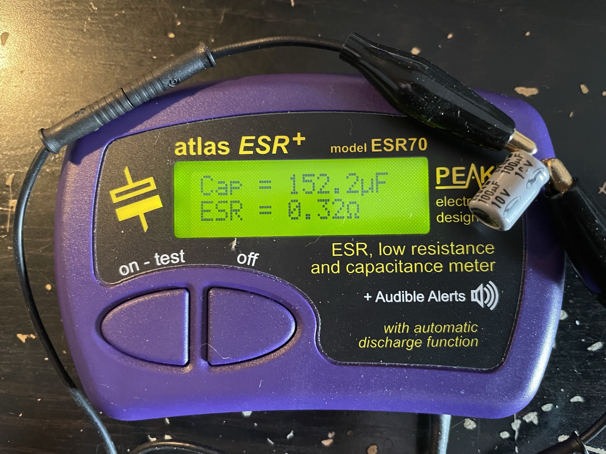 Après vérification de chaque vieux condensateur, mon appareil de mesure donnait quasiment tout le temps des valeurs de capacité supérieures d'au moins 20% à la capacité nominale.