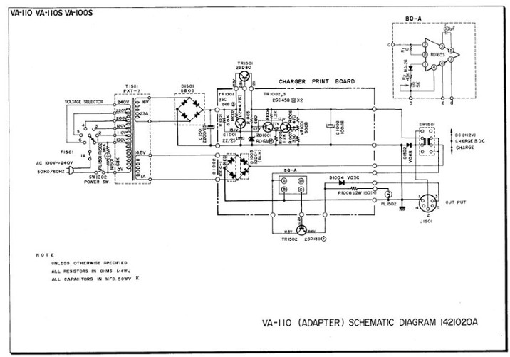 Dans le manuel de service de l’ensemble vidéo Akai VTS-110 (version 60Hz) (cet ensemble comprend le magnétoscope VT-110, l'alimentation VA-110, la caméra VC-115 et le moniteur VM-110), j’ai pu trouver le schéma de cette alimentation :