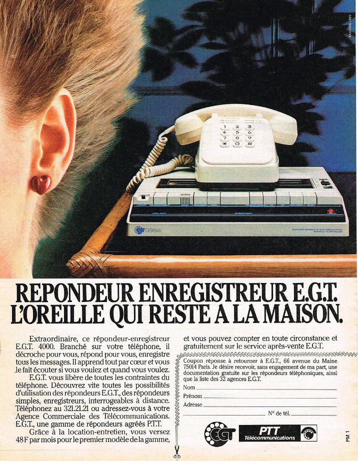 Source : https://www.ina.fr/ina-eclaire-actu/publicite/pub3249866007/egt4000-repondeur-la-declaration J’ai également trouvé cette publicité de magazine qui reprend l'esthétique de la publicité télévisuelle :