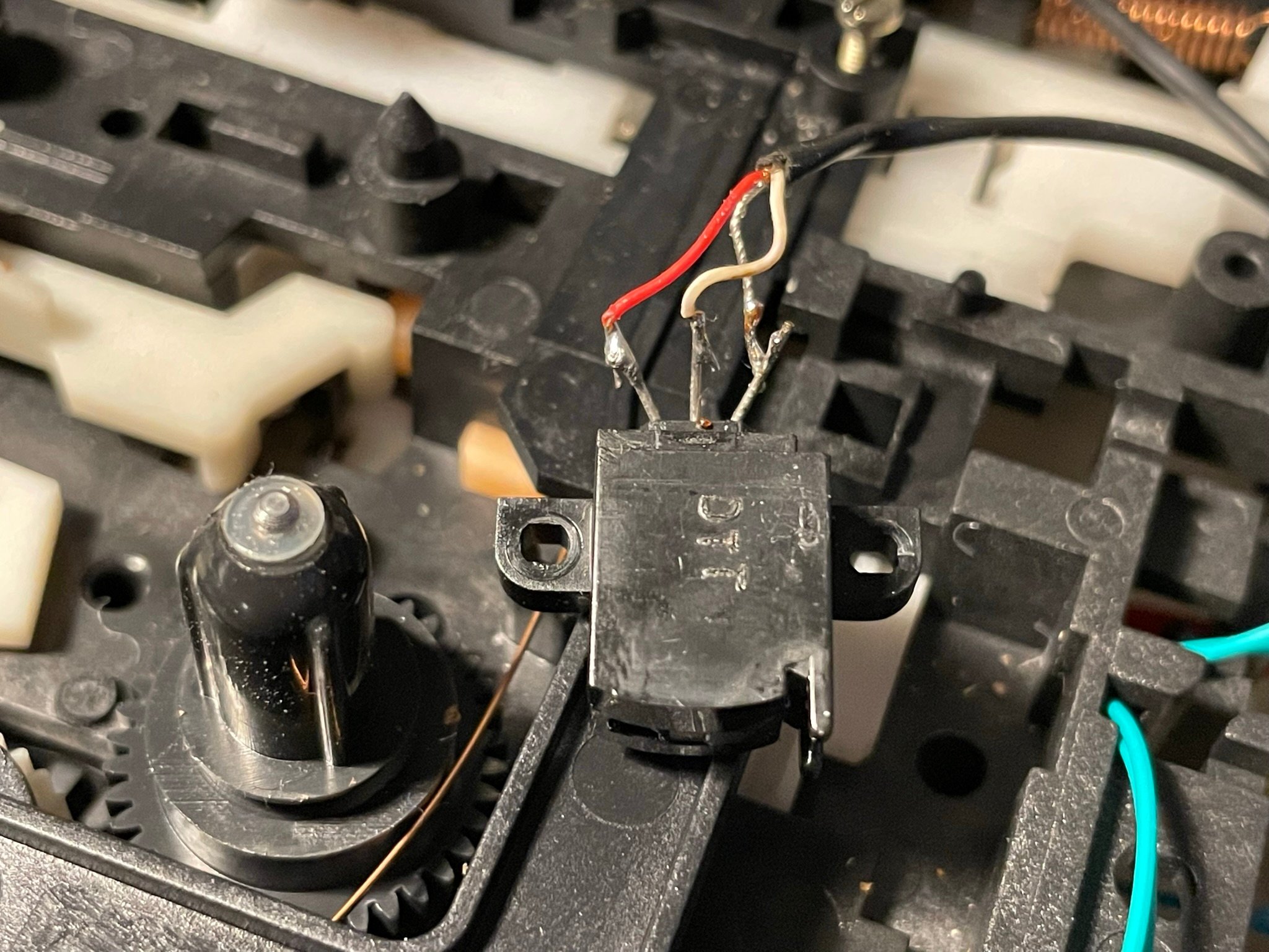 La modification a consisté a dessouder le switch qui permet de passer l’électronique du magnétophone du mode lecture au mode enregistrement pour extraire le contact d’où arrive normalement l’alimentation générale pour envoyer ensuite le courant vers le circuit oscillateur lorsque le switch est en position enregistrement et à relier ce contact avec un fil vers l’alimentation du moteur.