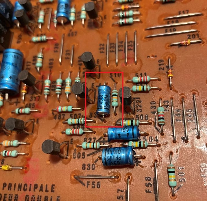 En essayer de trouver l’origine du problème, je remonte les signaux audio lues sur la bande qui passent à travers plein de composants et je remarque qu’il semble atténué lorsqu’il traverse un condensateur chimique.