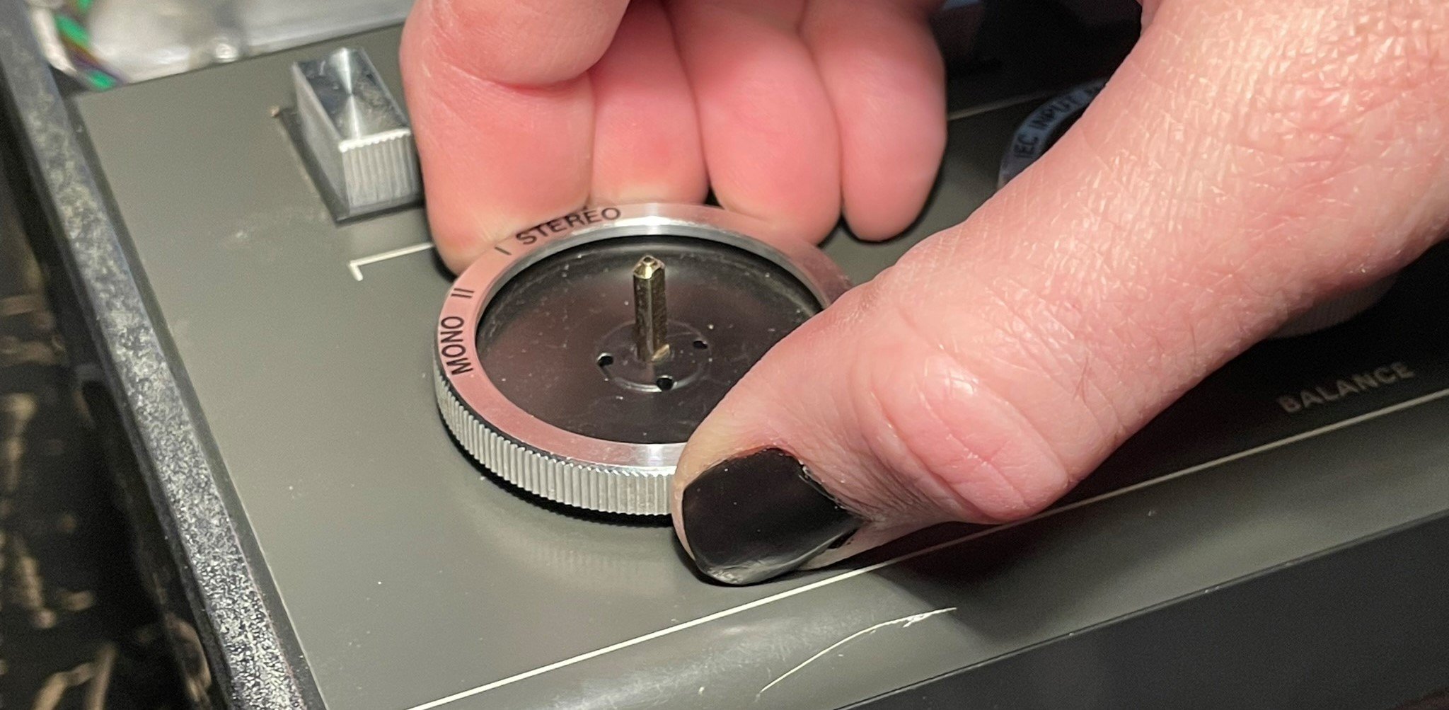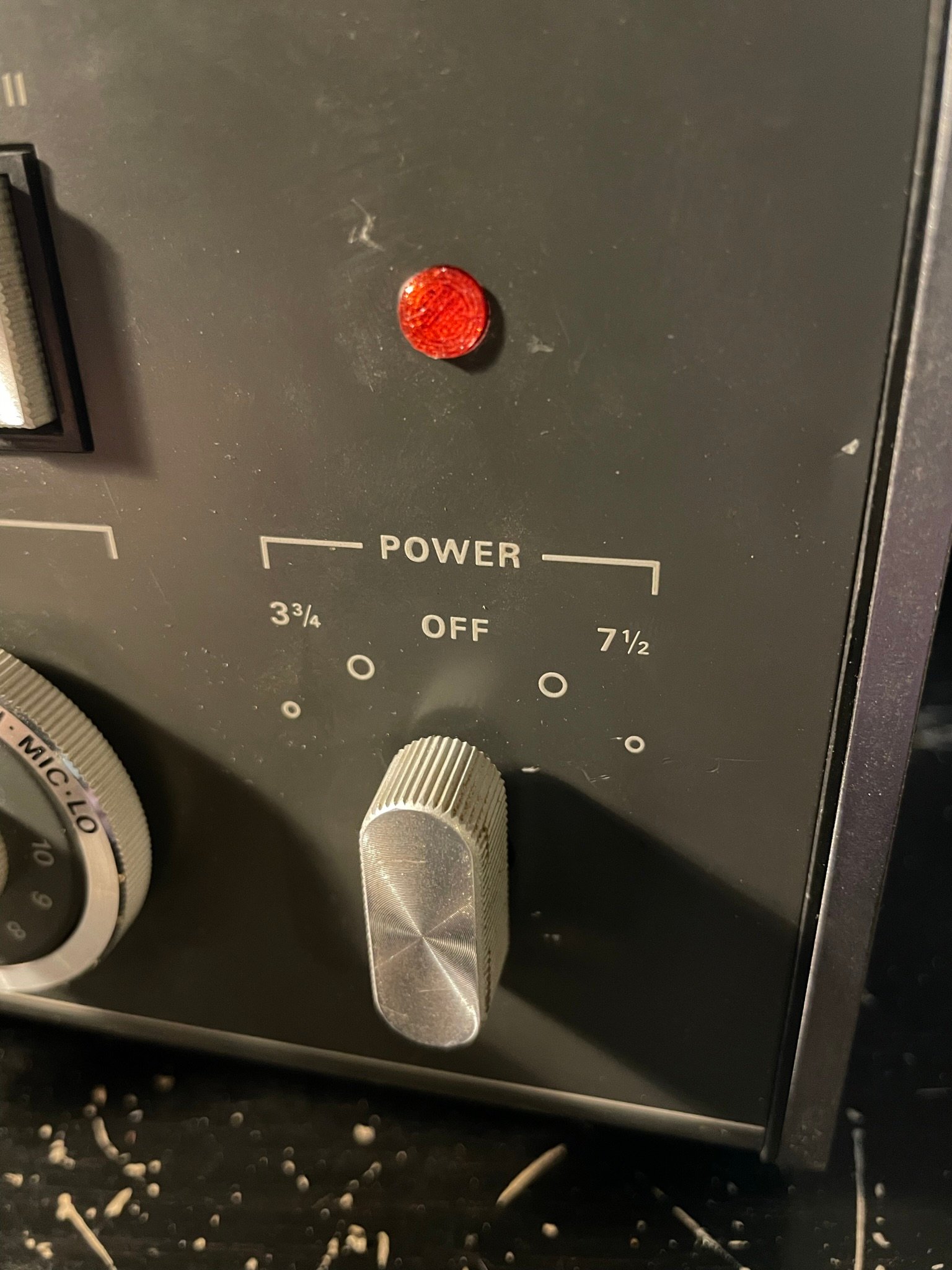 A droite, il y a le bouton de mise sous tension qui permet également de sélectionner la vitesse (« 3 3/4 » pouces/s pour 9,5 cm/s et « 7 1/2 » pouces/s pour 19cm/s) et indiquer le diamètre de bobine utilisée (gros rond pour grande de 26,5cm ou petit rond pour les autres).