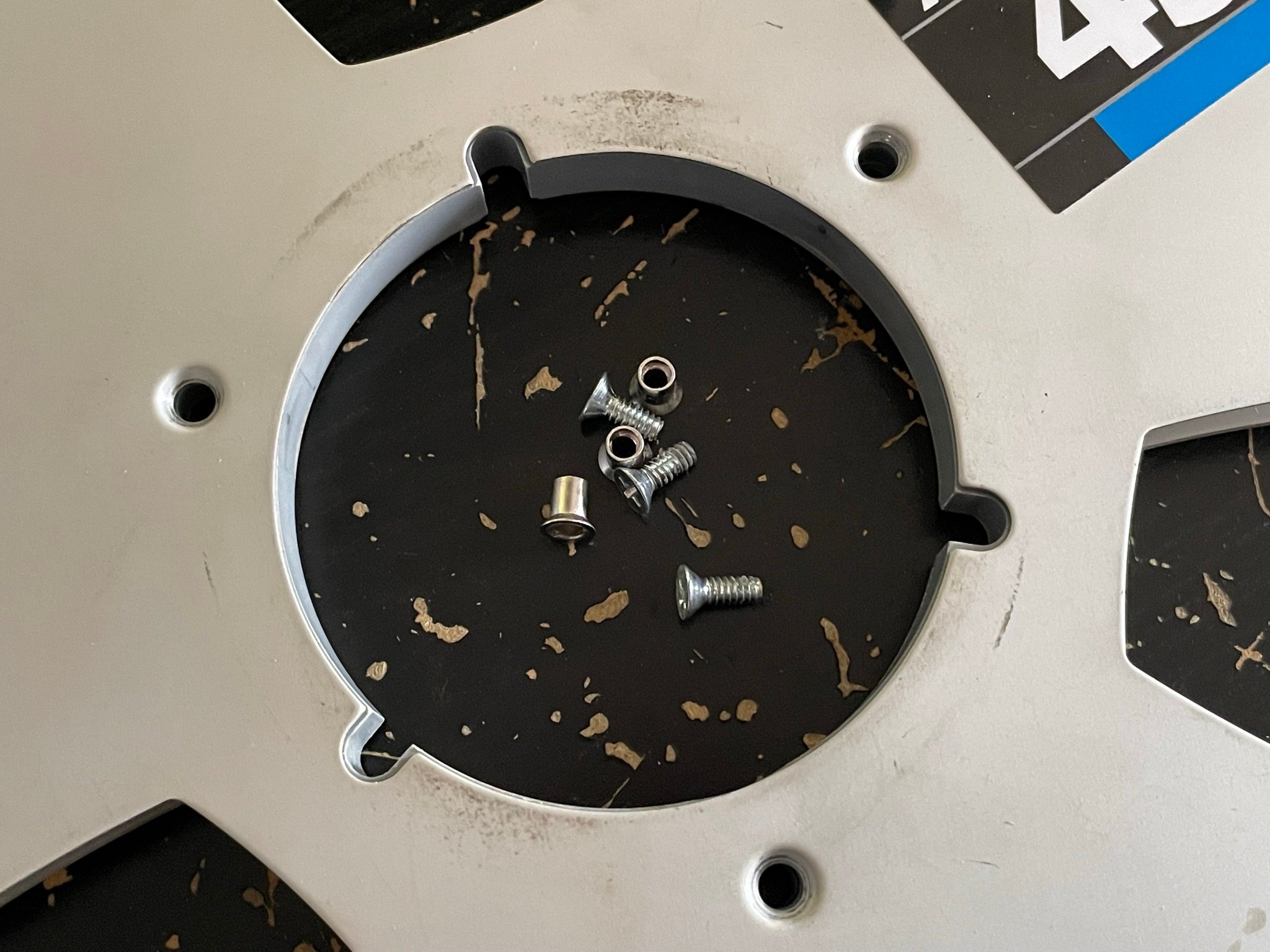 Mais si vous avez des bobines vides de 26 cm, il y a moyen de les reremplir en achetant de la bande neuve sous forme de « pancake » pour 55€, c’est à dire la bande enroulée simplement sur noyau en plastique noir pour un montage avec une attache NAB :
