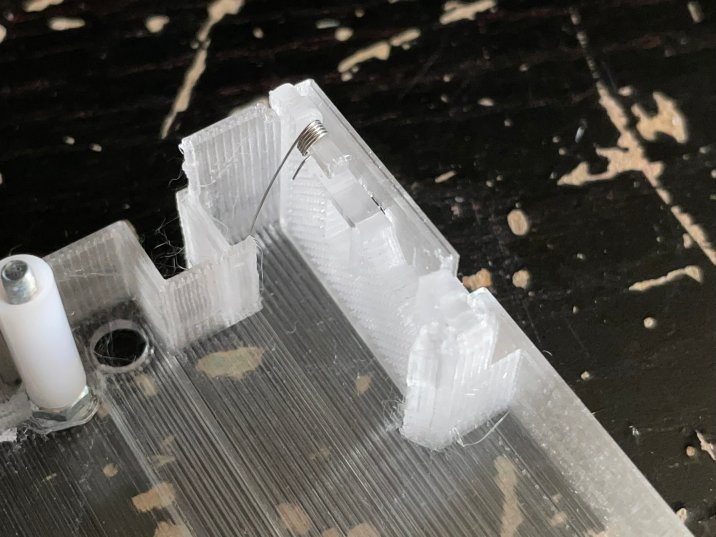 Après avoir imprimé la pièce supérieure, mettre en place la pièce métallique qui appuie sur les bobines.