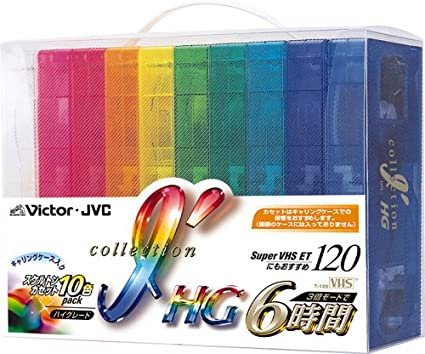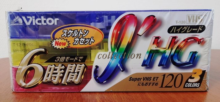 Grace à ces photos, j’ai pu identifier le modèle de cassette en question : il s’agit d’une VHS de marque Victor (JVC) de la série HG sortie uniquement au Japon en différentes couleurs.