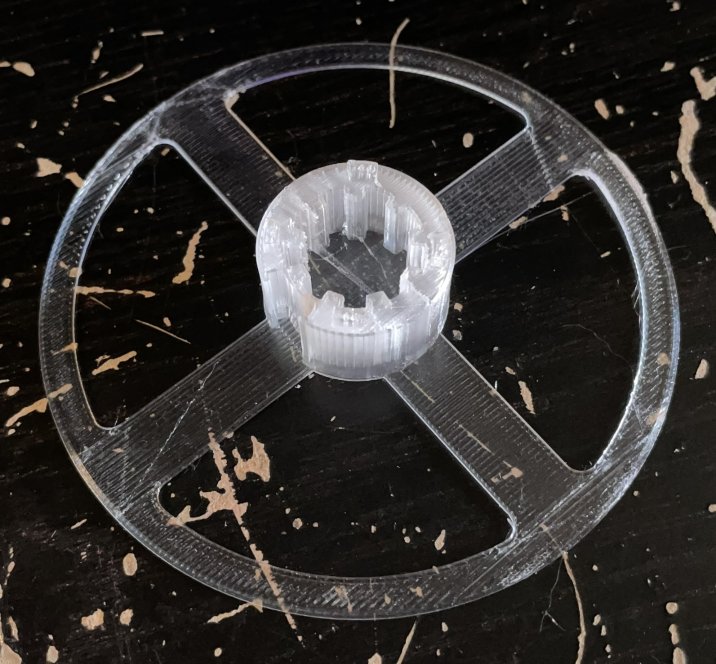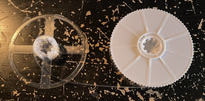 Cette bobine reprend le design d’une bobine d’une VHS du commerce avec les pignons sur le bord pour le système de verrouillages de bobines lorsque la cassette est hors du magnétoscope.