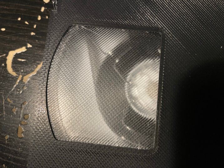 La vitre se pose côté intérieur de la pièce supérieure et se colle avec un fer à souder en faisant fondre le PLA des deux pièces ensemble :