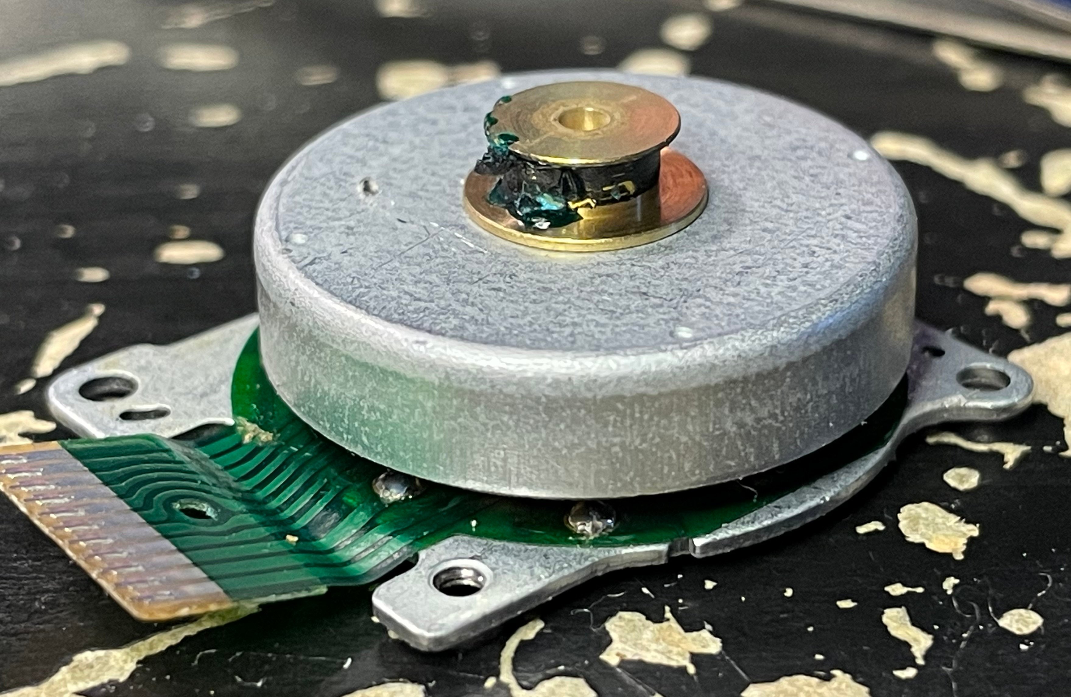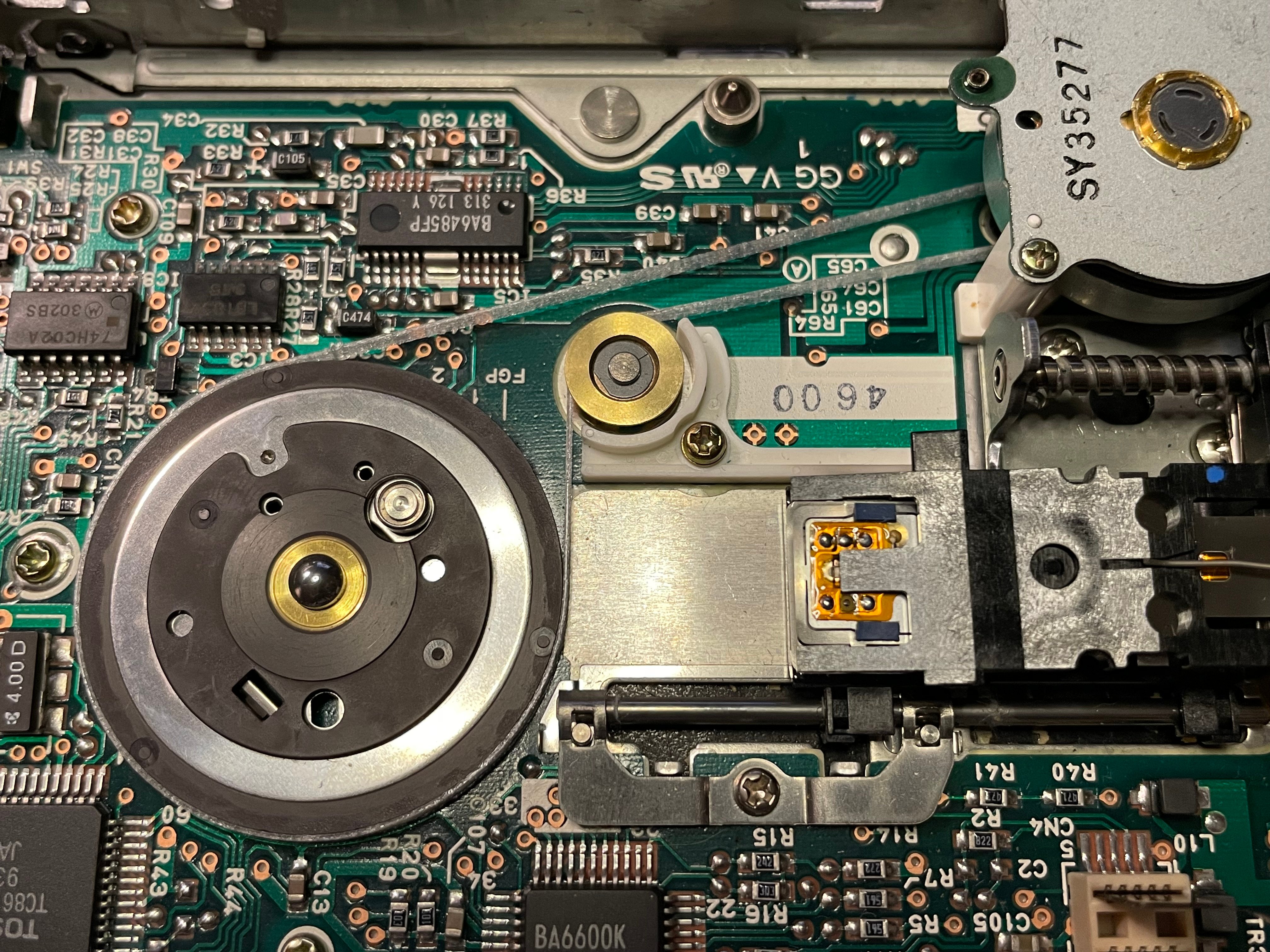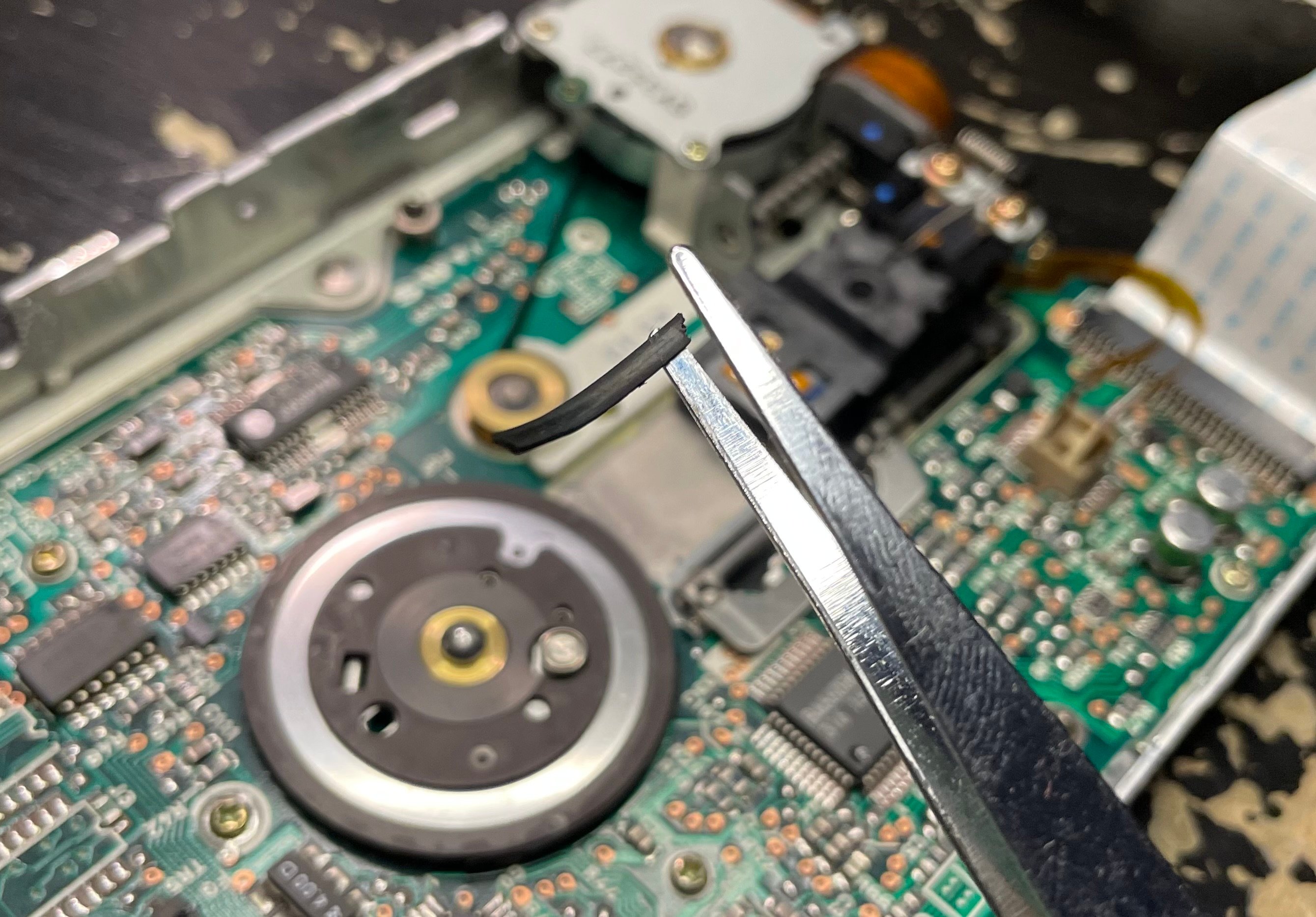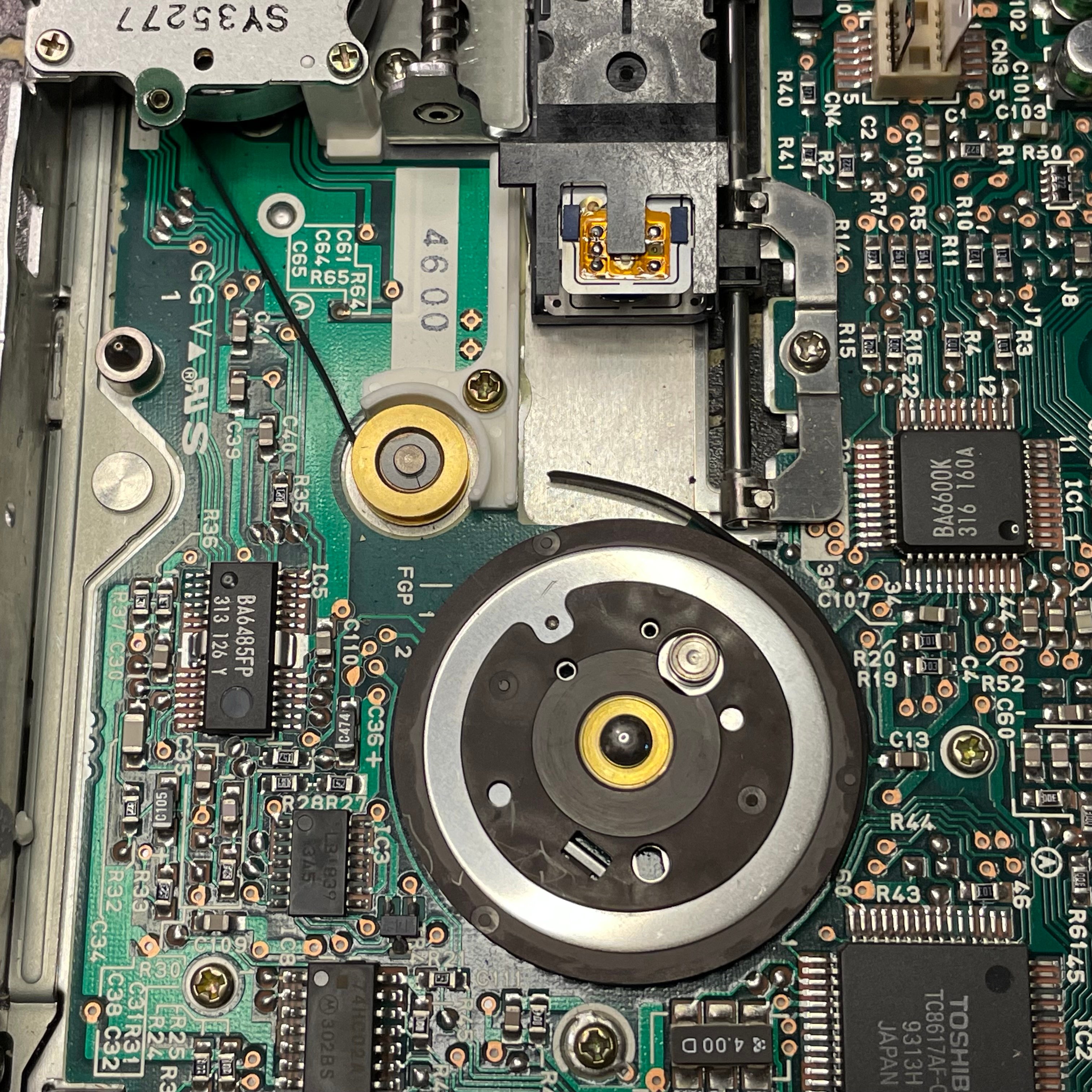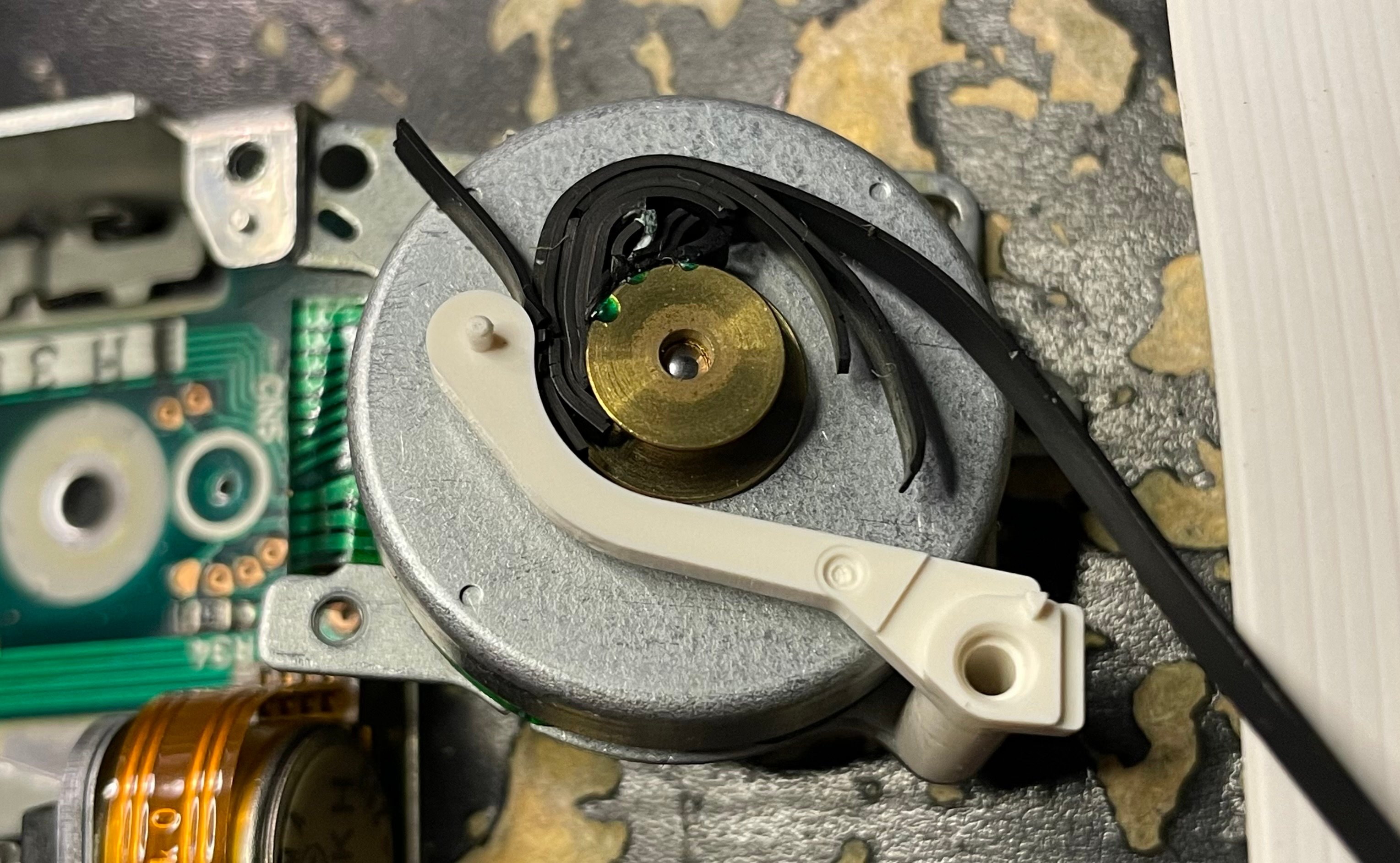 Une courroie, qui est sensée faire tourner un plateau qui permet de faire tourner le disque, a cassé et est devenue collante là où des morceaux sont restés.
