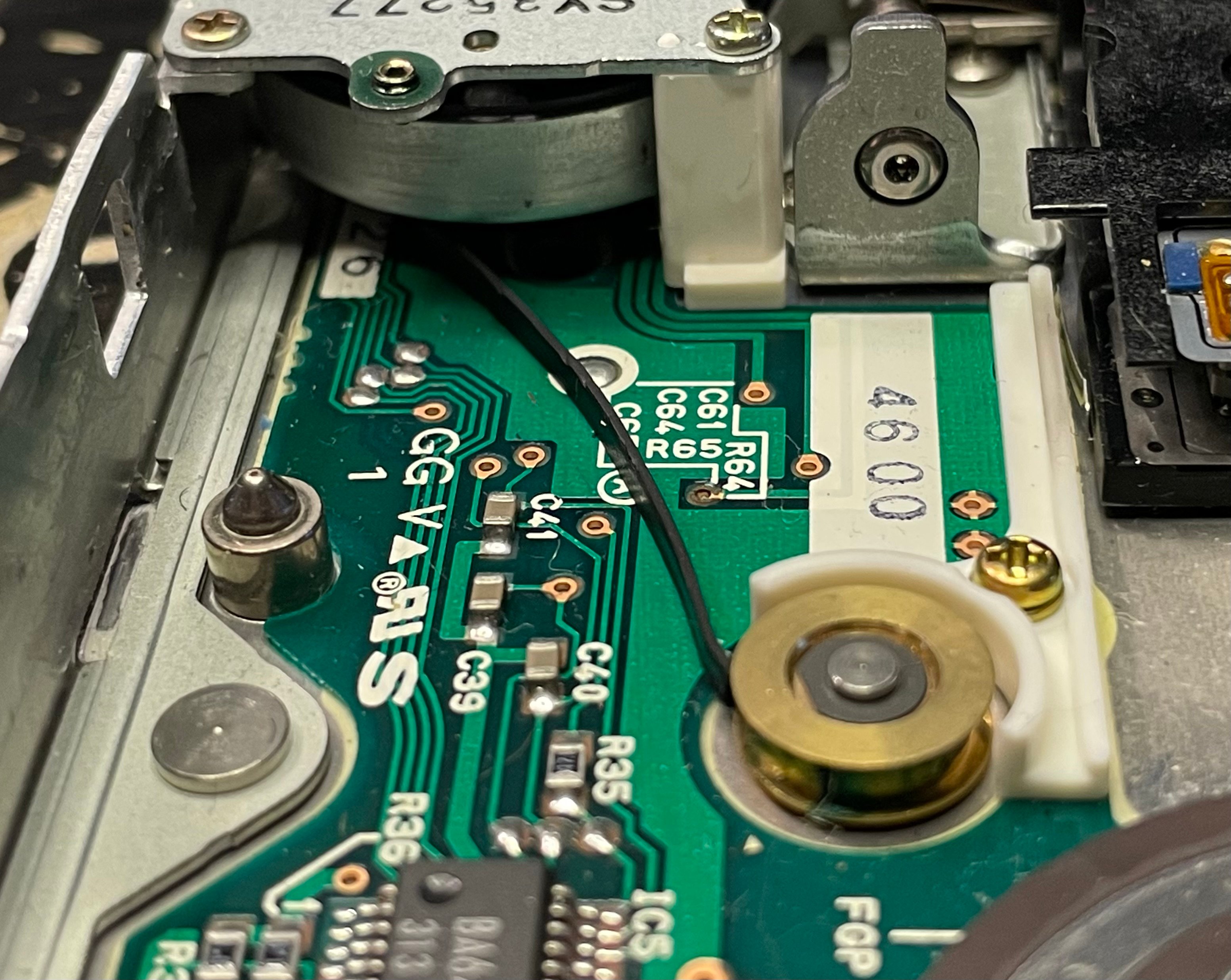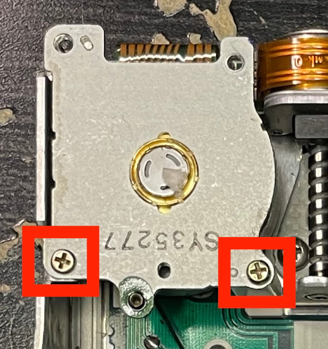 Si on démonte le moteur, situé dans le fond du lecteur, en retirer les deux vis entourés en rouge, on peut voir que de la courroie collante s'est accumulée dessus.