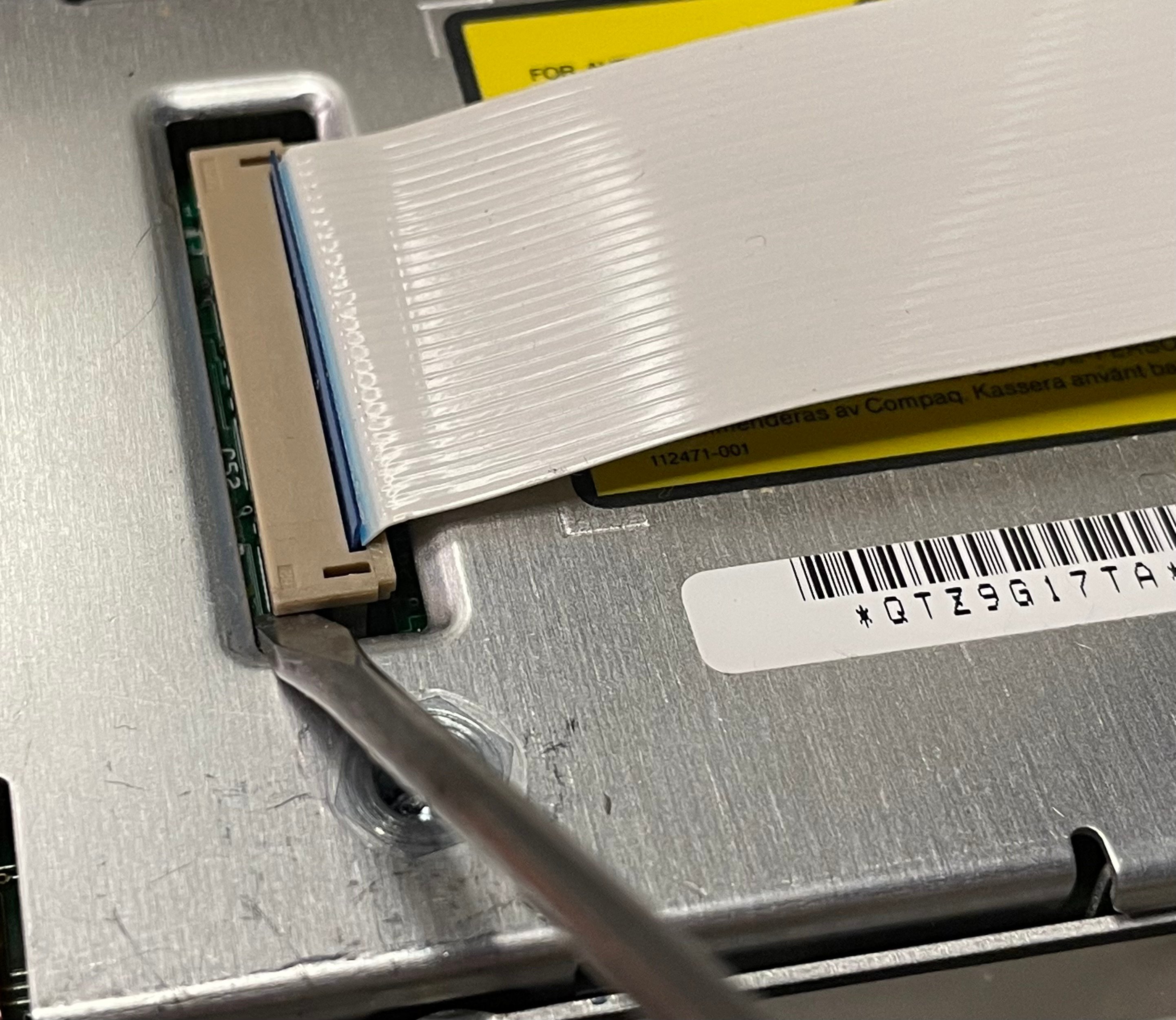 Pour retirer le lecteur de disquettes, on peut déjà déconnecter sa nappe à l'aide d'un tourne-vis plat.